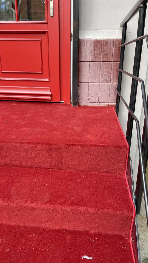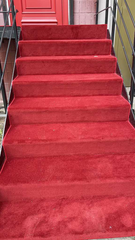 Ковролин был тщательно натянут и зафиксирован на лестнице, что исключает любые складки и неравномерности, которые могли бы испортить его внешний вид. Результат превзошел все ожидания: лестница, обрамленная красным ковролином, выглядит великолепно и привлекает внимание. Она не просто ведет к входу — теперь она стала настоящей визитной карточкой этого прекрасного здания.