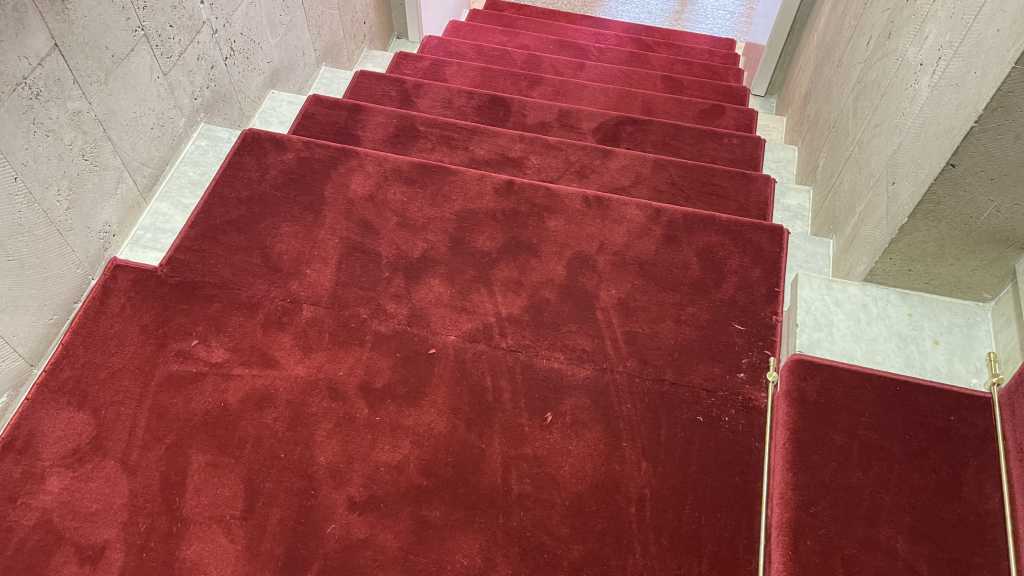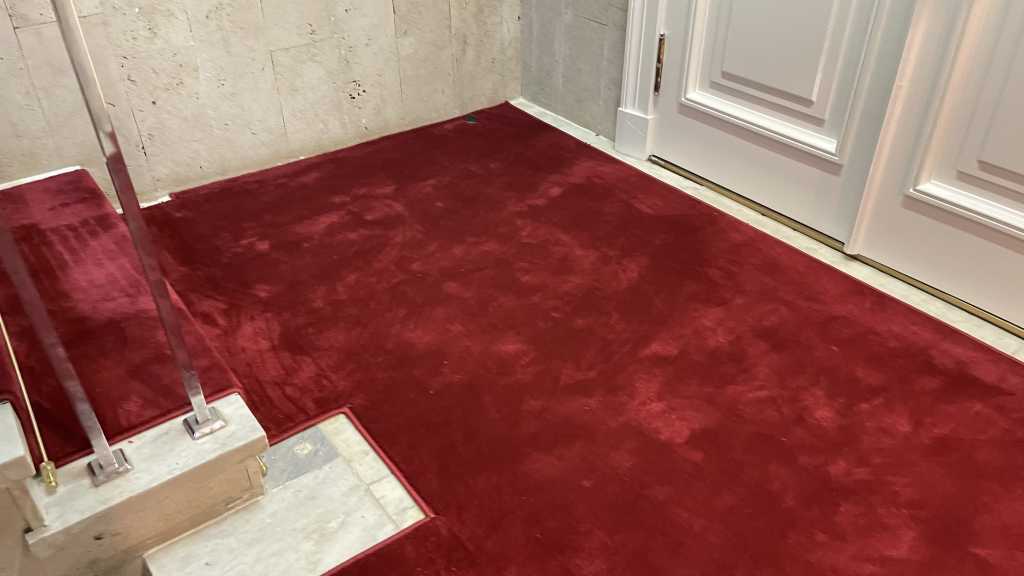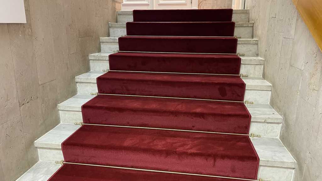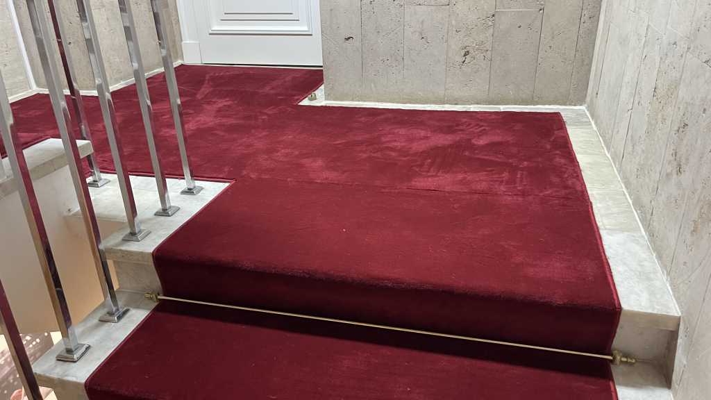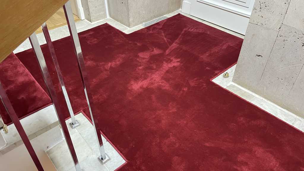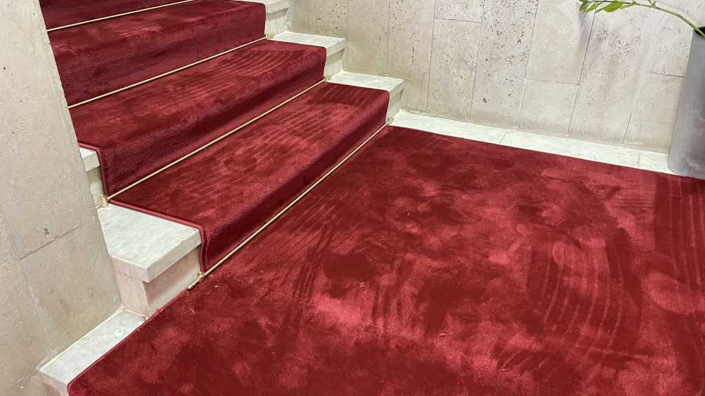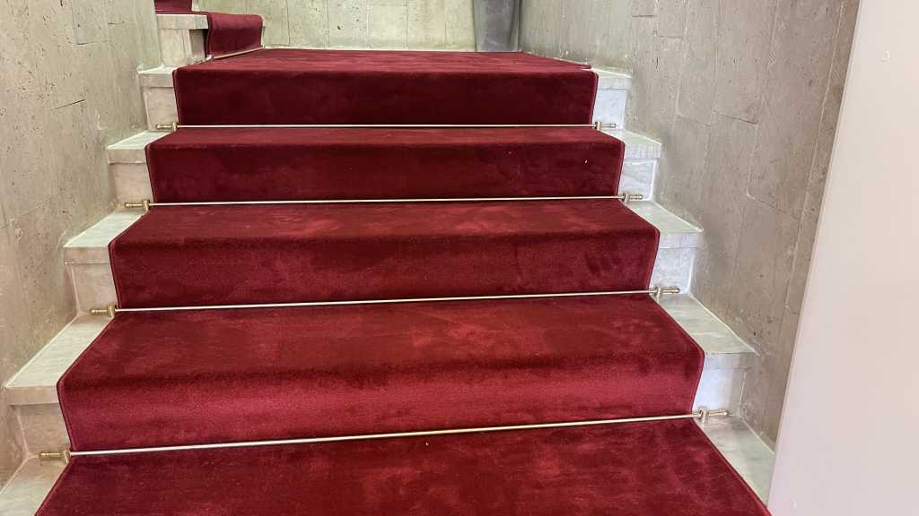 Перед нами стояла задача – застелить ковровыми дорожками мраморные лестничные марши сложной конфигурации так, чтобы это было не только качественно, но и красиво. Выбор был сделан в пользу классической красной высокоплотной