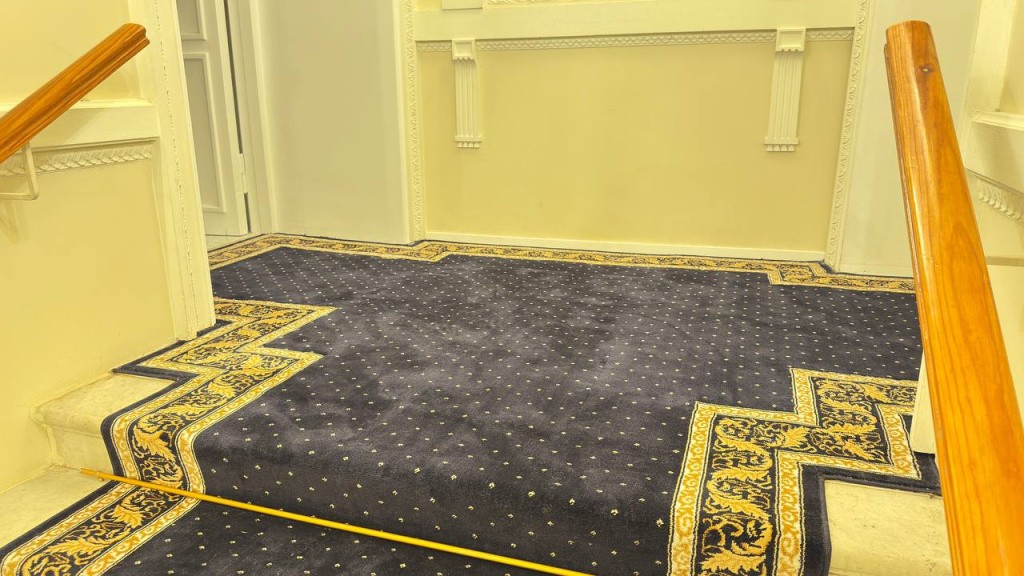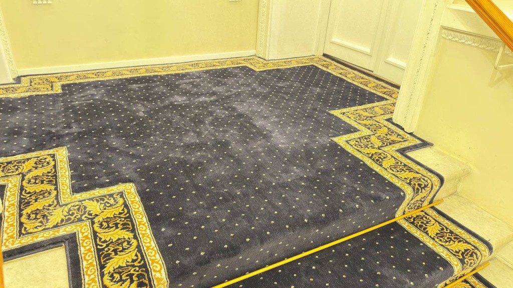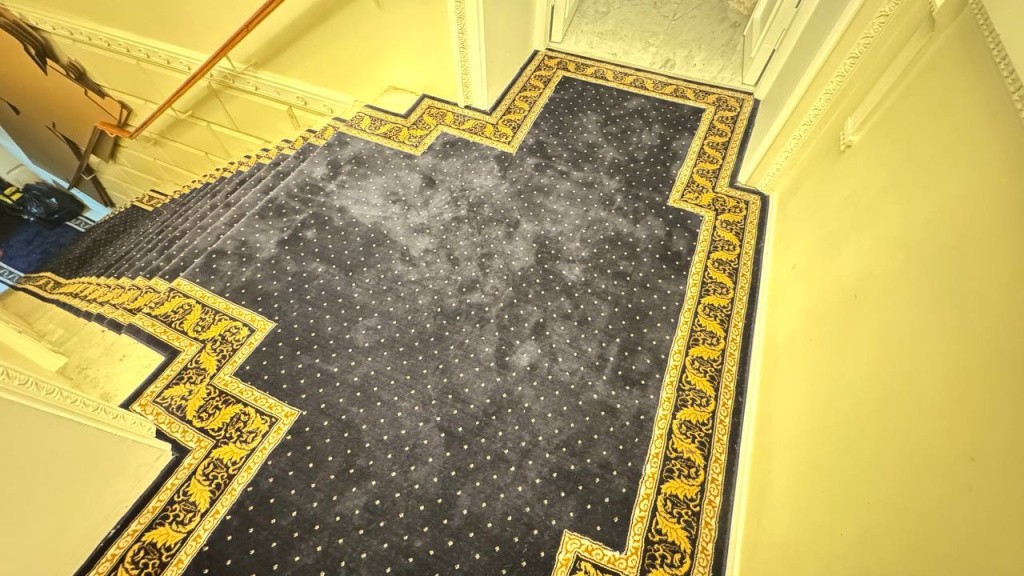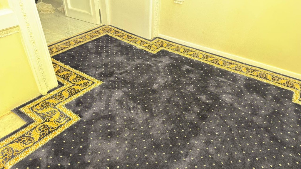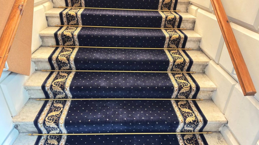 Монтаж дорожки производился с использованием латунных ковродержателей, которые обеспечили надежную фиксацию и долговечность покрытия. Это решение позволяет избежать смещения ковровой конструкции и гарантирует её идеальный внешний вид даже при интенсивной эксплуатации.