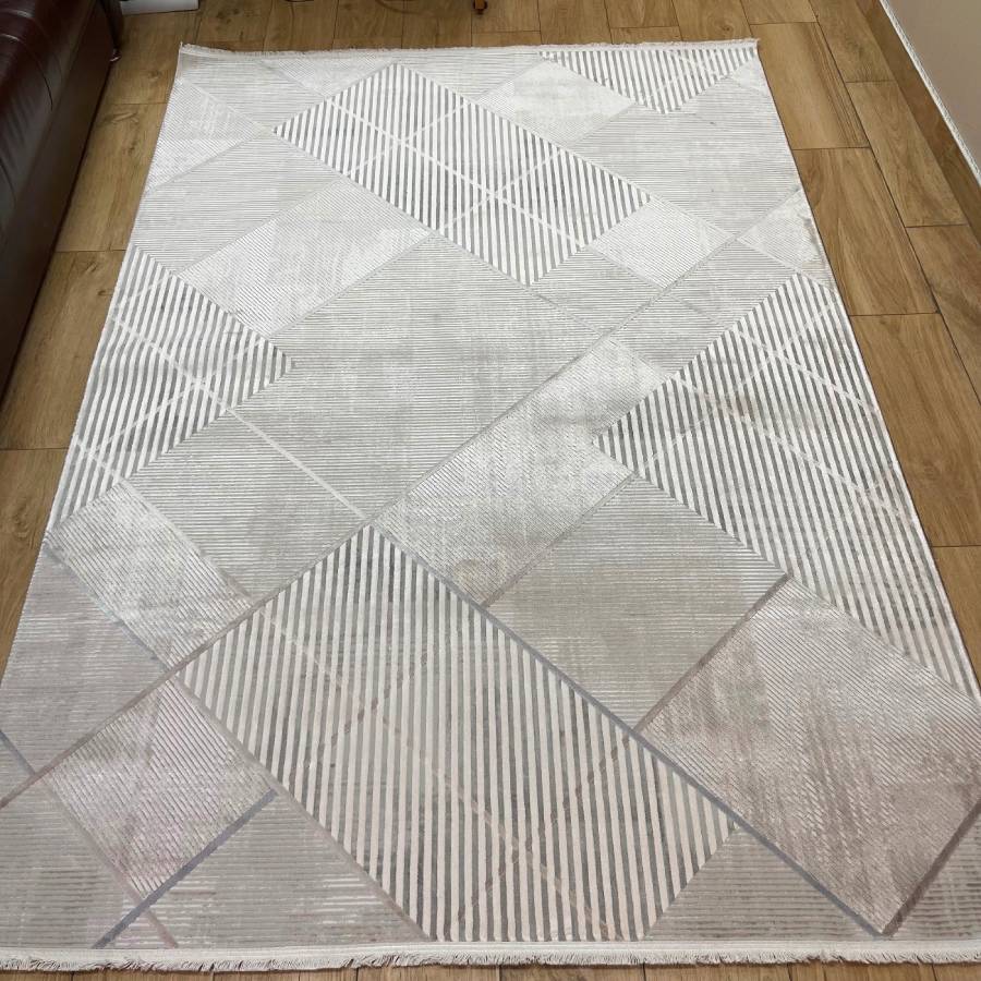 Основные цвета - белый, кремовый, светло-серый, серый - обеспечивают универсальное сочетание с различными интерьерами. Форма ковра прямоугольная, что делает его удобным и практичным в использовании.