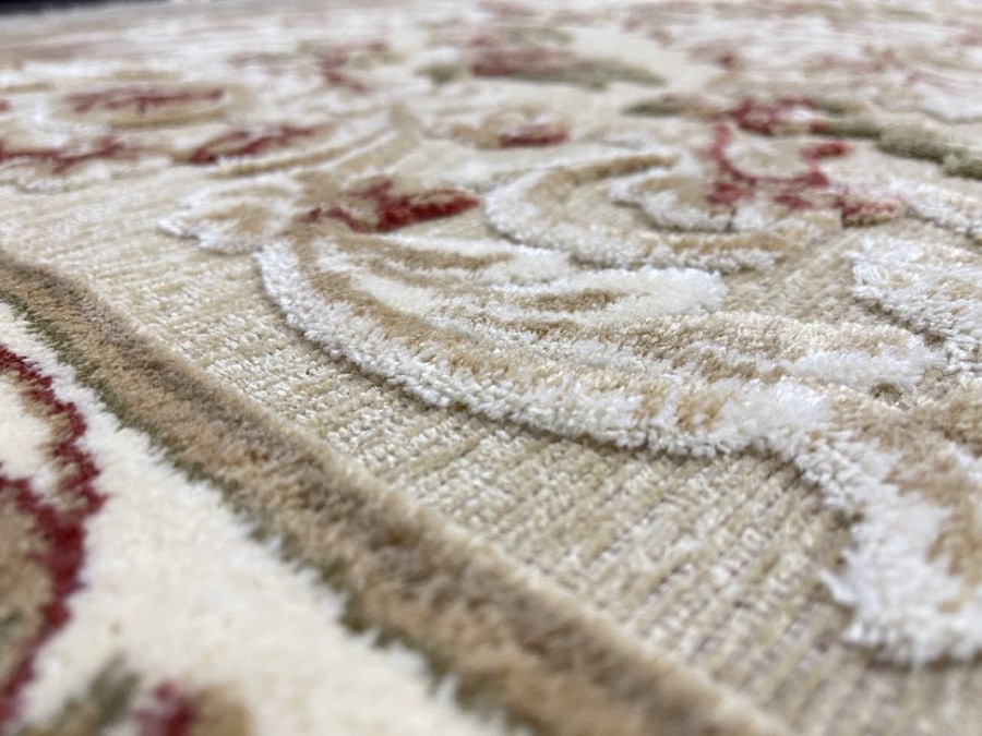 Ковры с невысоким рельефным рисунком на гобеленовой основе, рельеф придает приятный, красивый узор из вискозной нити, даже при не высоком ворсе, ковры смотрятся пышными, эффектными и красочными.