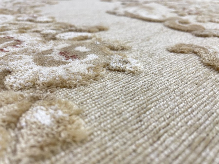 Ковры с невысоким рельефным рисунком на гобеленовой основе, рельеф придает приятный, красивый узор из вискозной нити, даже при не высоком ворсе, ковры смотрятся пышными, эффектными и красочными.
