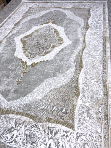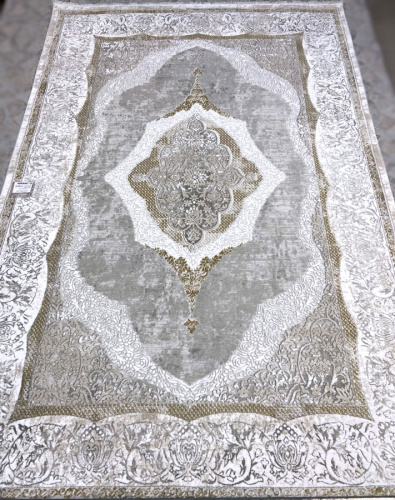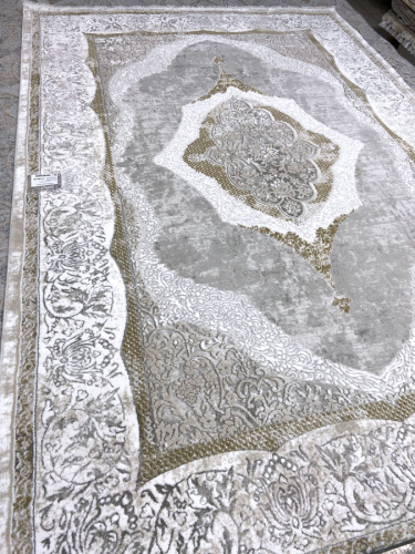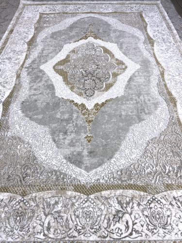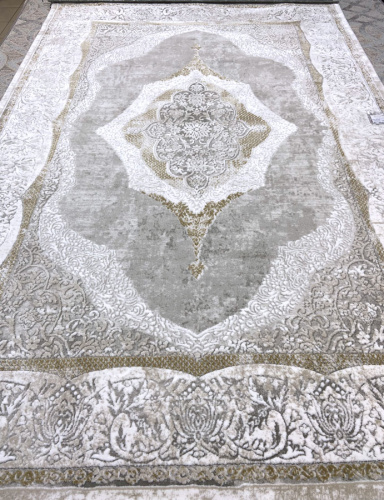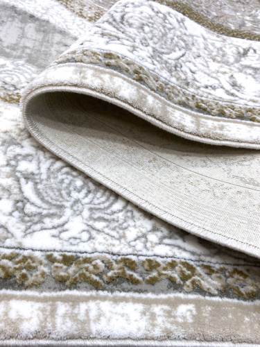 Мягкий и красивый турецкий ковер OTTO EMPERA 2802_ALMOND, цветовая гамма теплая в нежно серых тонах, основное поле светлое, края ковра имеют небольшую бахрому, великолепно вписывающуюся в эстетический вид изделия. Основа тканная из натурального джута. Изделие можно стирать, мыть, очень легок в уходе, антистатичный и антиаллергенный.