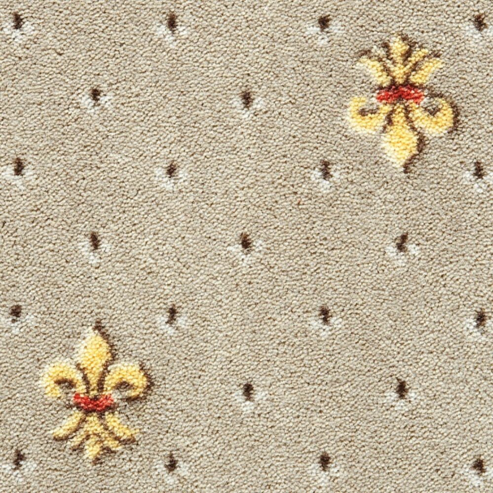 Классический бельгийский ковролин Heritage 34 с королевскими желтыми лилиями и мелкими черно-белыми фигурками, симметрично разбросанными по однотонному полю. Разрезной ворс из полиамида средней высоты 9 мм создает мягкую гладкую поверхность, которая не меняет первоначальный вид в условиях интенсивных ежедневных нагрузок от хождения в обуви.
