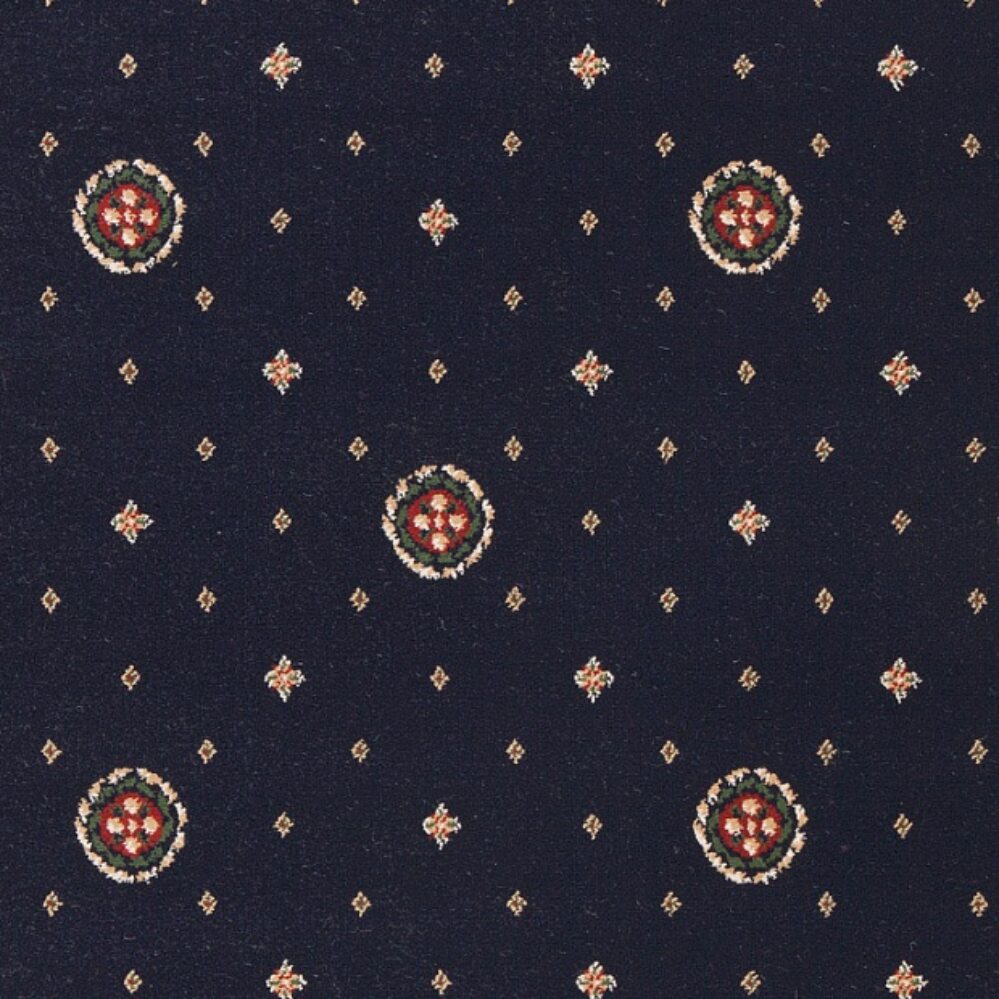 Роскошный ковролин Wellington 30 из «королевской» серии. Основа рисунка - желтая французская королевская лилия в сочетании с мелкими воздушными ромбами разного размера на однотонном темно-синем фоне. Тканый ворс высотой 8 мм из полипропилена образует мягкую идеально ровную поверхность.